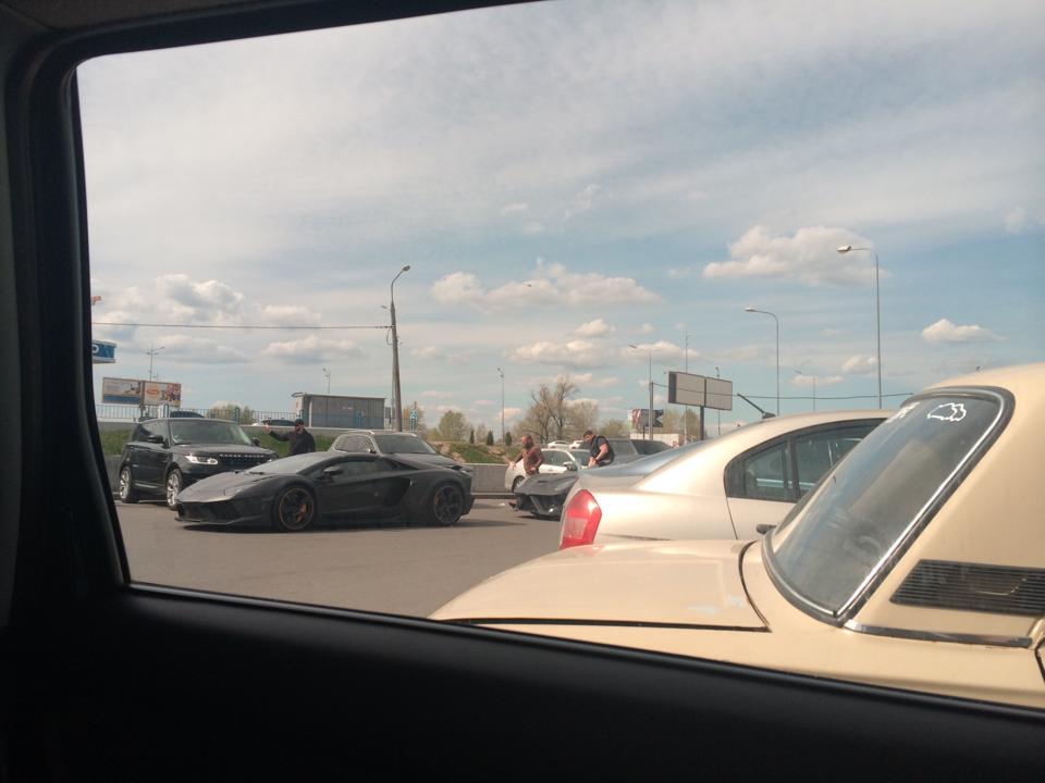 На проспекте Бажана, недалеко от М. "Осокорки", корреспондент "Страны" заметил Lamborghini, Ferrari, Mercedes-Benz и Range Rover общей стоимость 2,7 млн долларов. Все четыре машины приехали в спальный район, чтобы подкрепиться на McDrive.