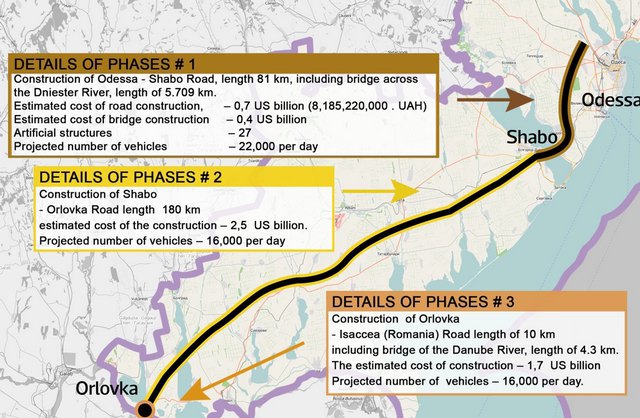 Строительство разделено на три участка: 81-километровый отрезок Одесса - Шабо (стоимость - $0,7 млрд плюс $0,4 млрд на мост через Днестровский лиман), 180-километровый участок Шабо - Орловка (стоимость - $2,5 млрд) и 10-километровый трансграничный участок с мостом через Дунай (стоимость - $1,7 млрд. Вероятно, частично эту сумму должна покрыть Румыния).