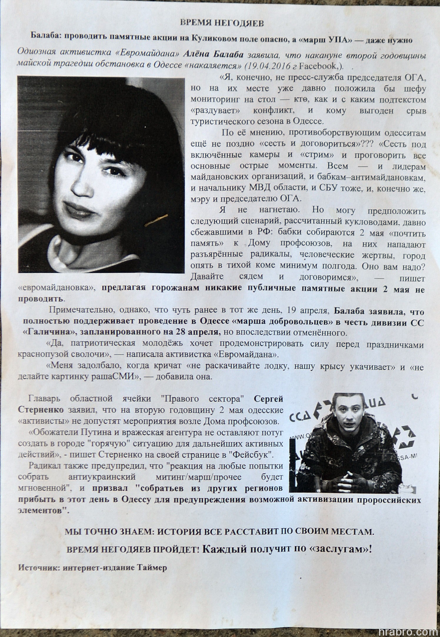 Сегодня в центре Одессы были замечены листовки с критическим и даже провокационным содержанием направленным против Алены Балабы (Евромайдан, Кризисный медиа-центр) и Сергея Стерненко (руководитель Правого сектора в Одессе).