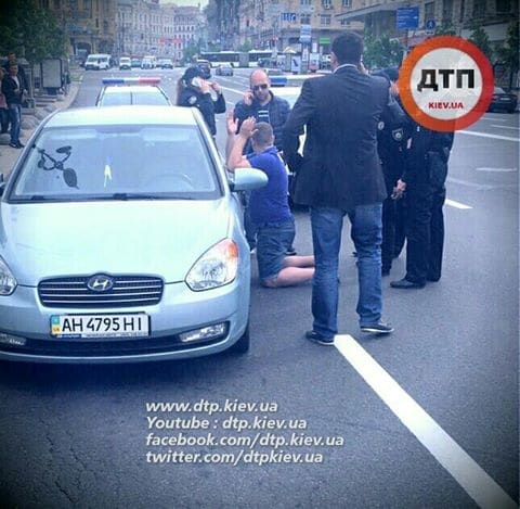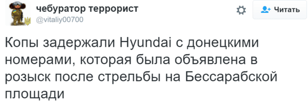 "Копы задержали Hyundai с донецкими номерами, который был объявлен в розыск после стрельбы на Бессарабской площади", - говорится в сообщении Виталия в Twitter.