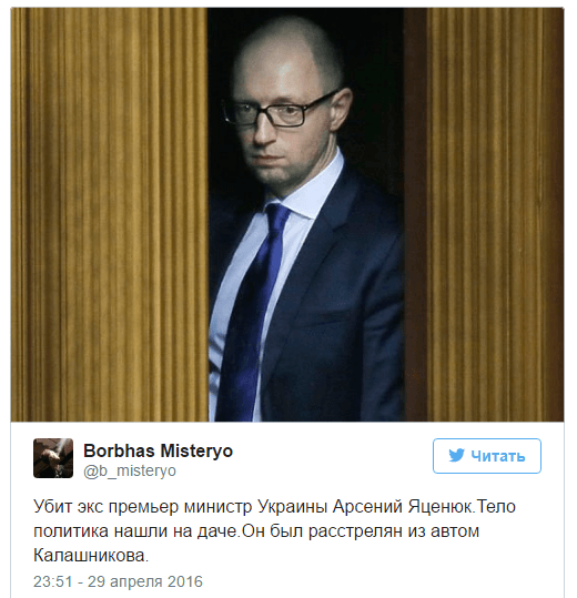 Одно из украинских изданий опубликовало информацию о том, что бывший премьер-министр Украины Арсений Яценюк был найден мертвым на своей даче.