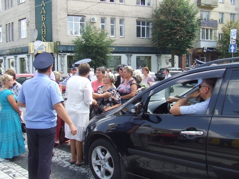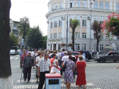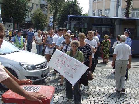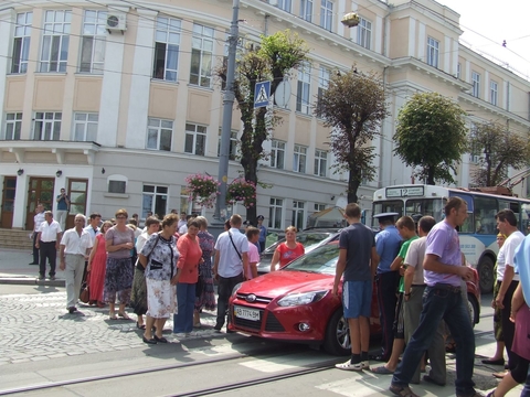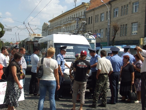 А близько 14.00 люди уже почали ходити туди-сюди по пішохідному переходу через Соборну, заважаючи таким чином руху транспорту. Протестуючі намагалися не пускати будь-які авто, за виключенням карет швидкої допомоги. Проте міліціонери час від часу зупиняли людей, щоб ті пропустили і громадський транспорт та приватні авто. Незабаром одній з організаторів акції Антоніні Рудій, головному зоотехніку господарства знадобилась допомога медиків, якій стало зле на сонці.