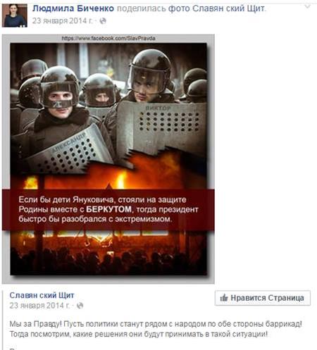 Кроме того, Биченко поддерживала «Беркут» во время Майдана, сетуя, что сыновья Януковича там не служат, а иначе бы расправа с «экстремистами» была бы куда более скорой.