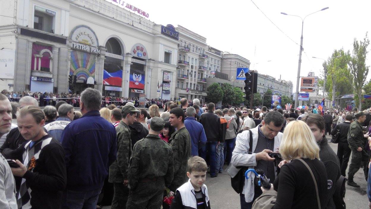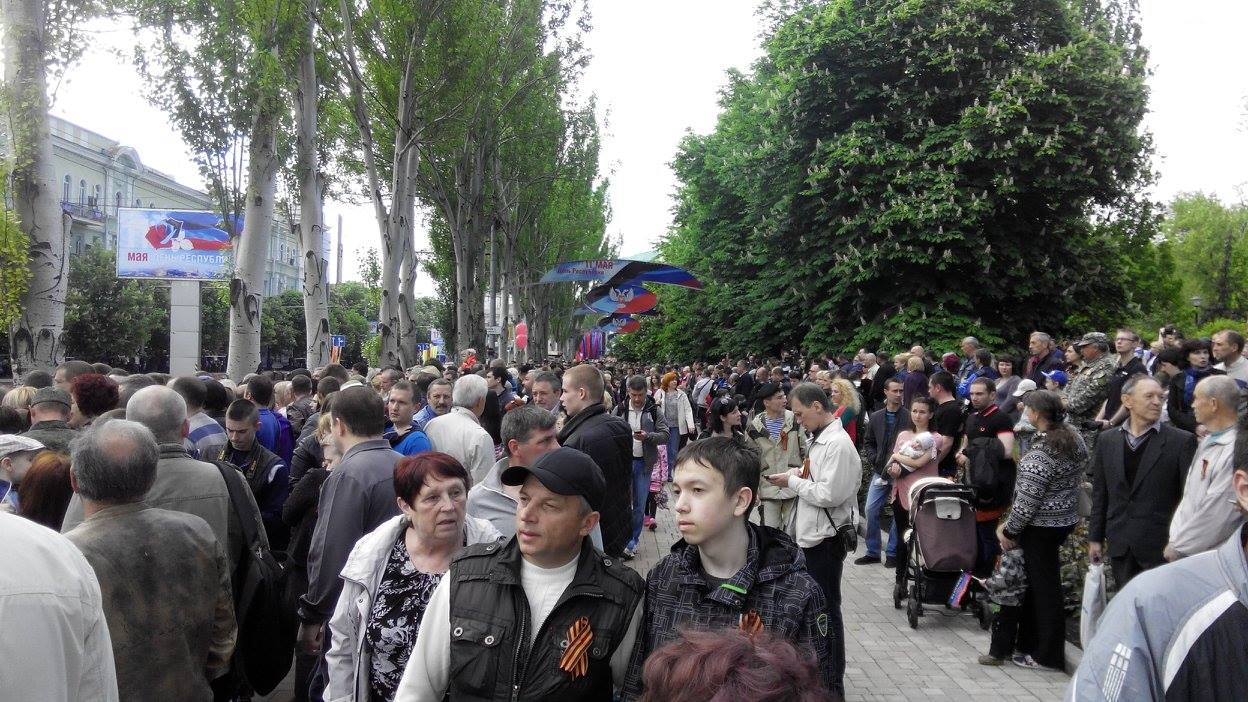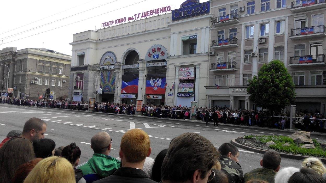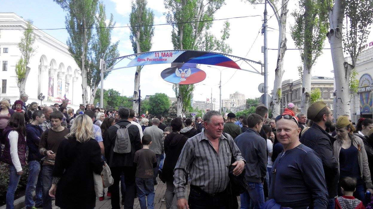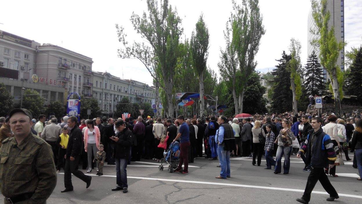 Отмечается, что в Донецк приезжают жители из окрестных городов. Люди держат в руках символику группировки «ДНР», сепаратистских движений «Молодая республика» и «Донецкая республика», а также символику Советского союза.