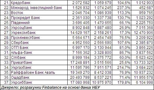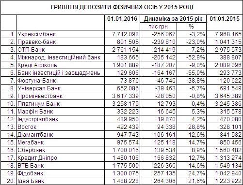 По гривневим депозитам фізосіб ситуація менш драматична. Із 34 банків з найбільшим обсягом зазначених вкладів відтік був у 9 фінустанов: Укрексімбанку, Правекс-банку, ОТП Банку, Міжнародному інвестиційному банку, банку «Креді Агріколь», Банку інвестицій та заощаджень, Фортуна-Банку, Універсал Банку, Промінвестбанку.