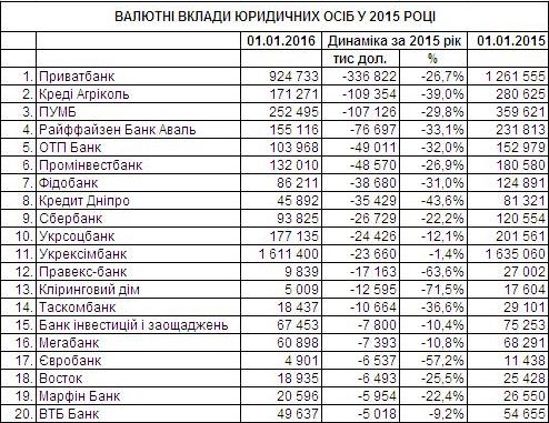 З даних НБУ випливає, що торік абсолютна більшість банків із вказаної групи зафіксувала відтік валютних депозитів населення (див. нижче таблицю). В абсолютному вимірі (сума) найбільшим відтік цих вкладів був у Приватбанку, Сбербанку, Укрексімбанку, ПУМБ та Альфа-Банку. У відносному вимірі (частка портфелю) – в Таскомбанку, Ідея Банку, Правекс-банку, Фідобанку та банку «Кредит Дніпро».