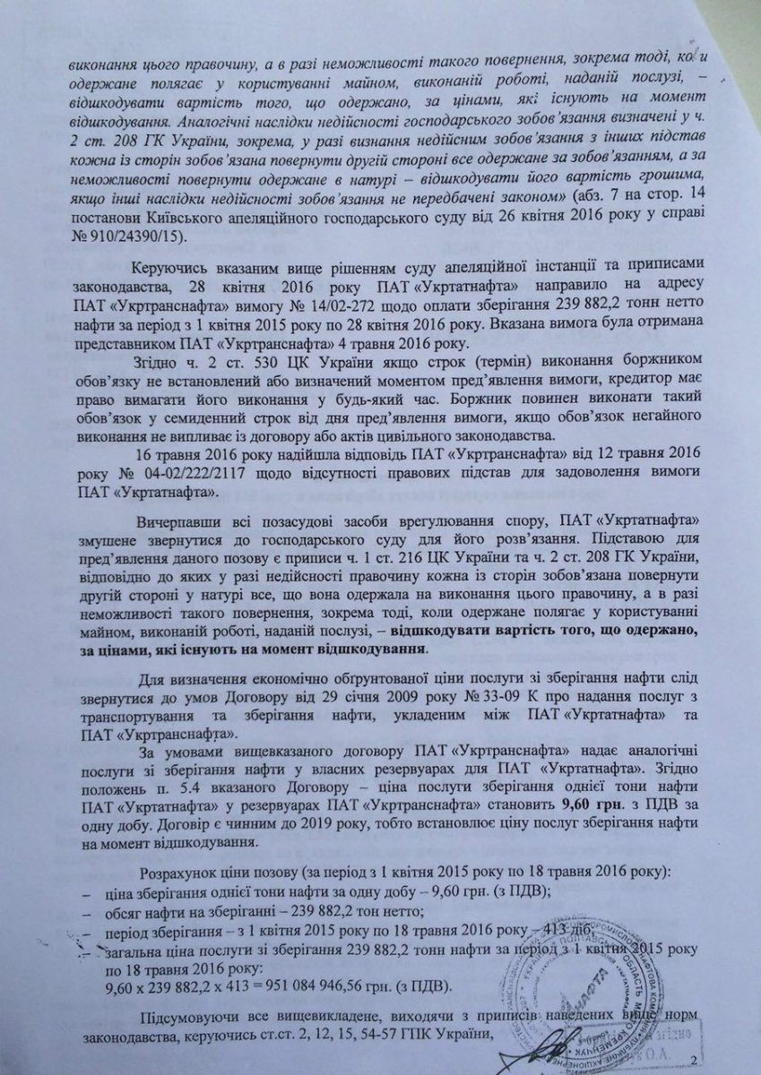 28 апреля 2016 г. «Укртатнафта» направила «Укртранснафте» требование об оплате хранения нефти за период с 1 апреля 2015 г. по 28 апреля 2016 г. Стоимость услуги была увеличена в 1,5 раза по сравнению с изначальной ценой – с 6,4 до 9,6 грн/т в сутки.