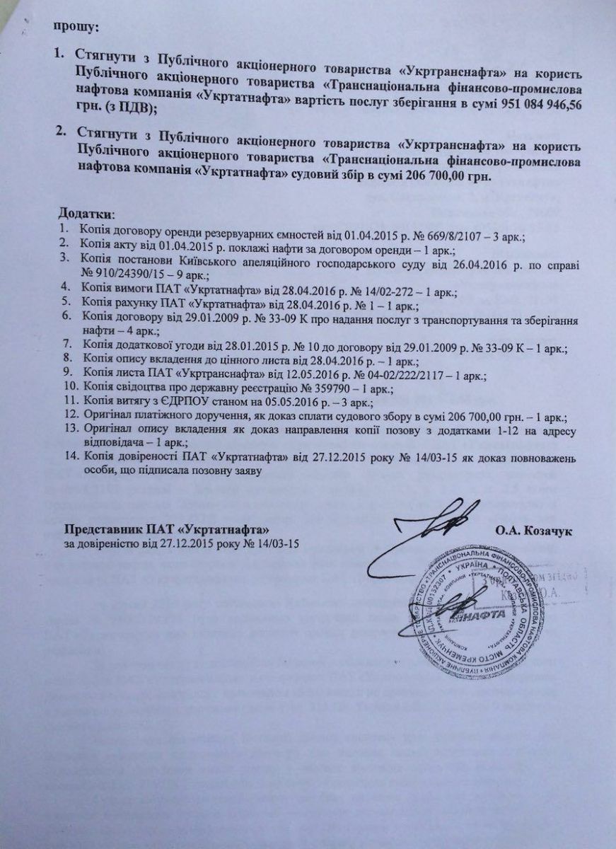 «Укртатнафта» требует от «Укртранснафты» оплату за хранение нефти по тарифу 9,6 грн/т в сутки. Это в полтора раза выше ранее установленного тарифа за аренду резервуаров. Общая сумма иска – 951 084 946,56 грн. Копия искового заявления подконтрольной «Привату» структуры имеется в распоряженииOilNews.