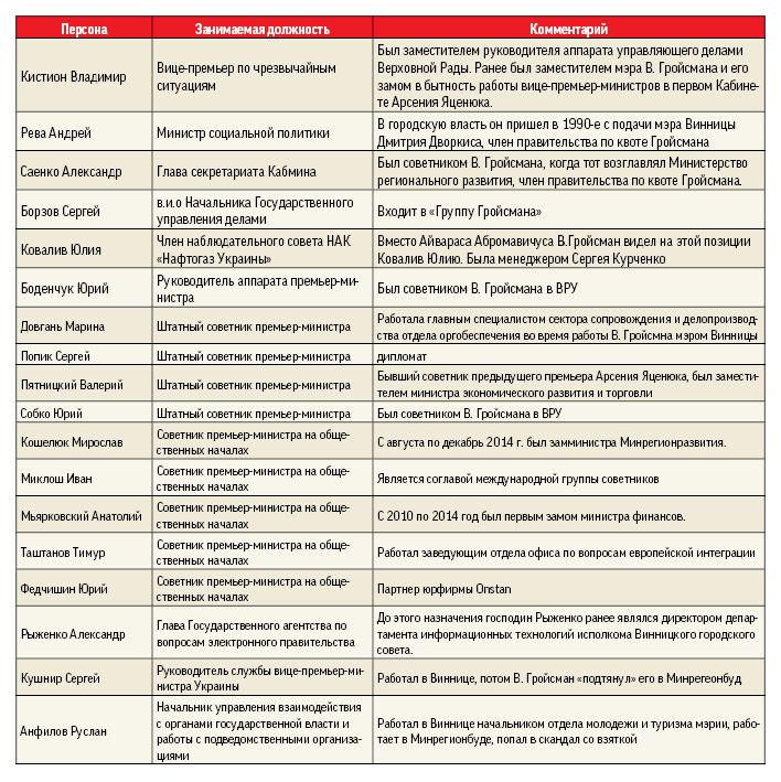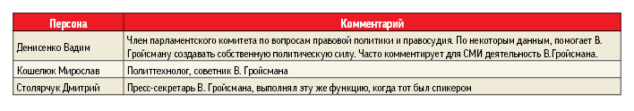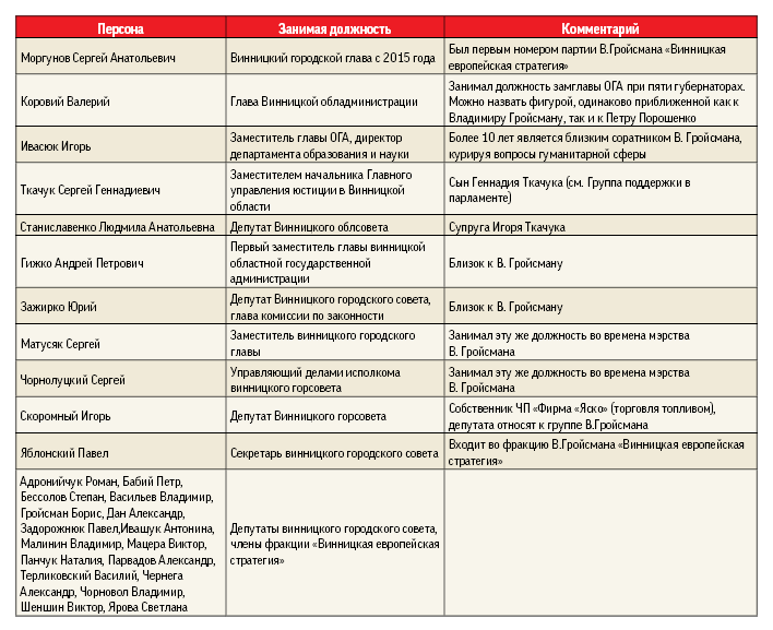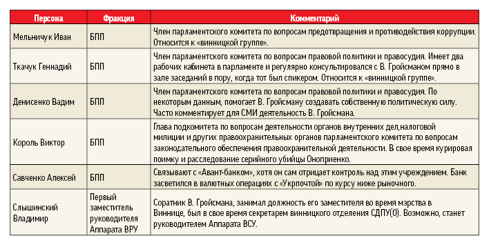 У Владимира Гройсмана нет личной фракции в парламенте, как у Арсения Яценюка или Петра Порошенко. Но это не мешает ему формировать ядро поддержки среди депутатов (См. ТАБЛИЦА №2), главным образом членов президентской БПП. Сегодня пока невозможно четко определить «группу Гройсмана», она находится в стадии формирования, и ее ядро уже проявляется.