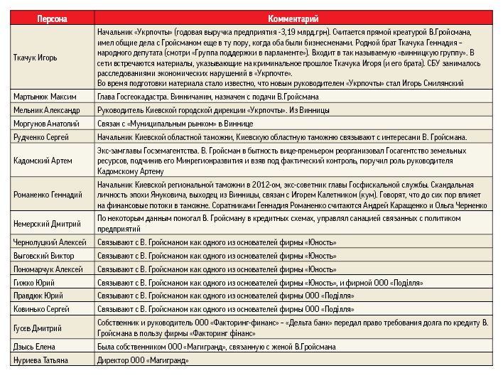 Игра в большую политику требует мощной финансовой и ресурсной подпитки. Тут мы вторгаемся в область предположений и косвенных связей. Тем не менее, ядро людей, с определенной долей вероятности подставляющих плечо Владимиру Гройсману (и которые не входят во властную вертикаль) в виде материальной поддержки, существует.