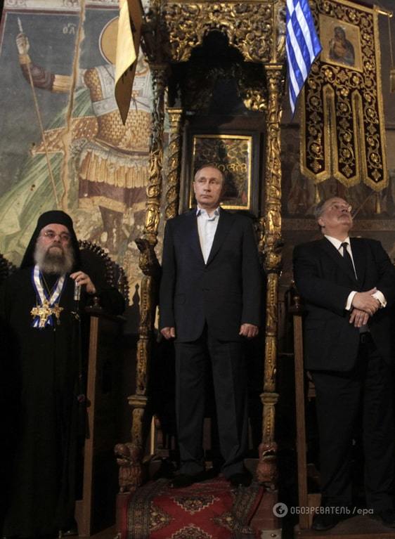 Президент России Владимир Путин в ходе своего визита на Святую гору Афон в Греции сел в кресло византийских императоров, над которым развевались греческий и византийский флаги.