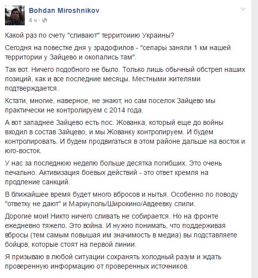 “Никто ничего сливать не собирается. Но на фронте ежедневно тяжело. Это война. И нужно понимать, что поддерживая вбросы (тем самым повышая им значимость в медиа) вы подставляете бойцов, которые стоят на первой линии”, - призвал журналист.