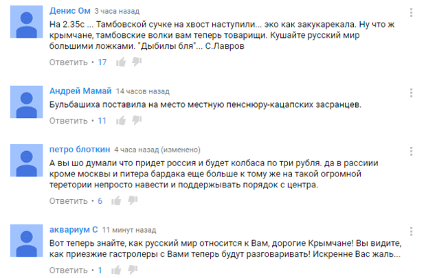 "Вас не спросили, что вам надо. Нам здесь разрешили торговать, вот мы и торгуем. Вы думаете, как при Украине, все ваше? Вот пришла Россия – будет порядок, как положено! А вы бы срач в своем городе убрали! Везде грязь, во дворы не зайти!"