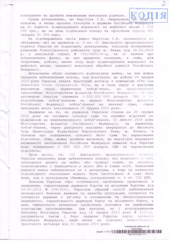 Український суд заарештував 3 млрд доларів російського кредиту. ДОКУМЕНТ