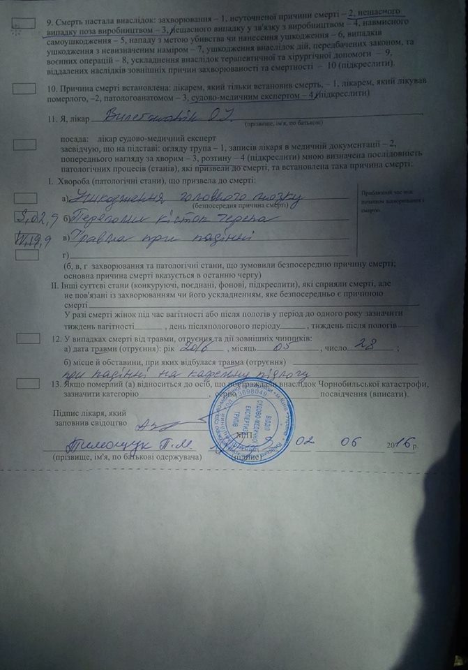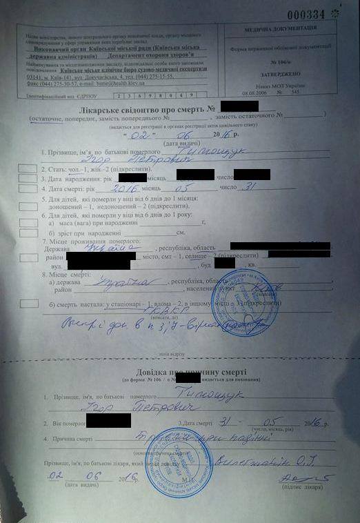 «У него был там конфликт с ротным. Его там избивали, отбили селезенку, ребра, но он не жаловался никуда и мне ничего не говорил. Когда еще раз его избили, то у него лопнула барабанная перепонка и он лежал в госпитале. Затем его выписали 5 апреля и ему угрожали, что как только он попадет в часть, то его убьют. Это именно его слова. И он не поехал, боялся и поехал домой. Он не ехал в часть, 27 мая приехали, я так понимаю, из военной прокуратуры Дарницкого гарнизона из Киева, участковый был, и забрали его в Киев. Он был на связи, звонил и говорил, что в Киеве в прокуратуре, а затем его забрали в часть, и там где его избили сильно, разбили голову, и он в коме уже 28-го был в госпитале, уже при смерти, а умер вчера (31 мая - ред.). А они уже там говорят, что это у него эпилепсия была, да он упал, и тот раз была эпилепсия, да он упал. Он не болел эпилепсией. Говорят, что он алкоголь употреблял. Я спрашивал врача реанимации, есть ли у него еще какие-то травмы, кроме на затылке, от которой он умер, то он говорит, что есть под глазом хороший синяк на груди гематома, возможно, и еще что-то, нас к нему не пускали. Он был призван по 4-й волны мобилизации. Он ездил и в Луганск, и в Донецк, и в Чонгаре был. Приехал я подавать заявление в прокуратуру, а у меня ее не хотели принимать, как я уже сказал, чтобы представились, то приняли », - рассказал Петр Тимощук.