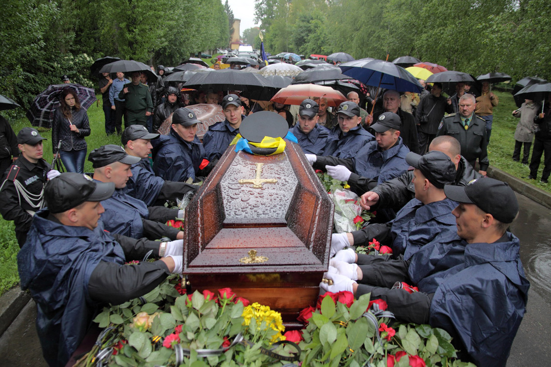 Та ось у цвинтарній брамі показалась процесія: нацгвардійці, які несли труну із тілом свого генерала і охороняли його почесною вартою, високі чини, що прибули на похорон, аби віддати належне бойовому офіцеру. Рідні - дружина, син, невістка… Розгублені, відсторонені, неначе й досі не ймуть віри, що господар не прийде до рідної домівки, не освітить її тою особливою посмішкою, ледь іронічною, але теплою і доброю, в очікуванні якої легше переносити довгі розлуки, пов`язані зі службою чоловіка та батька.