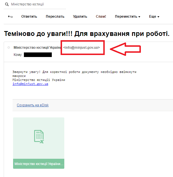 Якщо вірити спеціалістам, схема атаки на комп’ютер нотаріуса виглядає так: спочатку хакери відправляють лист, замаскований під офіційну розсилку Мін’юсту. На прохання «Главкому» CyberLab надала скріншот одного з таких листів.