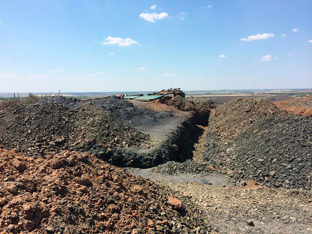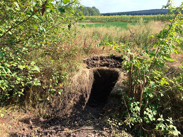 В тот же день мы сделали интересную находку. Выбрали хорошую точку обзора, угольный отвал вблизи Гукова, поднялись наверх. Оказывается, террикон облюбовали не только мы. Там обнаружились траншеи, и в них – окошки вроде бойниц, обращенные к местам сражения. Слишком капитальное укрепление для простых наблюдателей. Возможно, там сидели корректировщики огня. Кто мог это делать с российской территории? На полу траншеи – оторванная нашивка ФСБ, но выглядит это постановочно: как предупреждение случайно забредшим местным жителям: не лезьте.