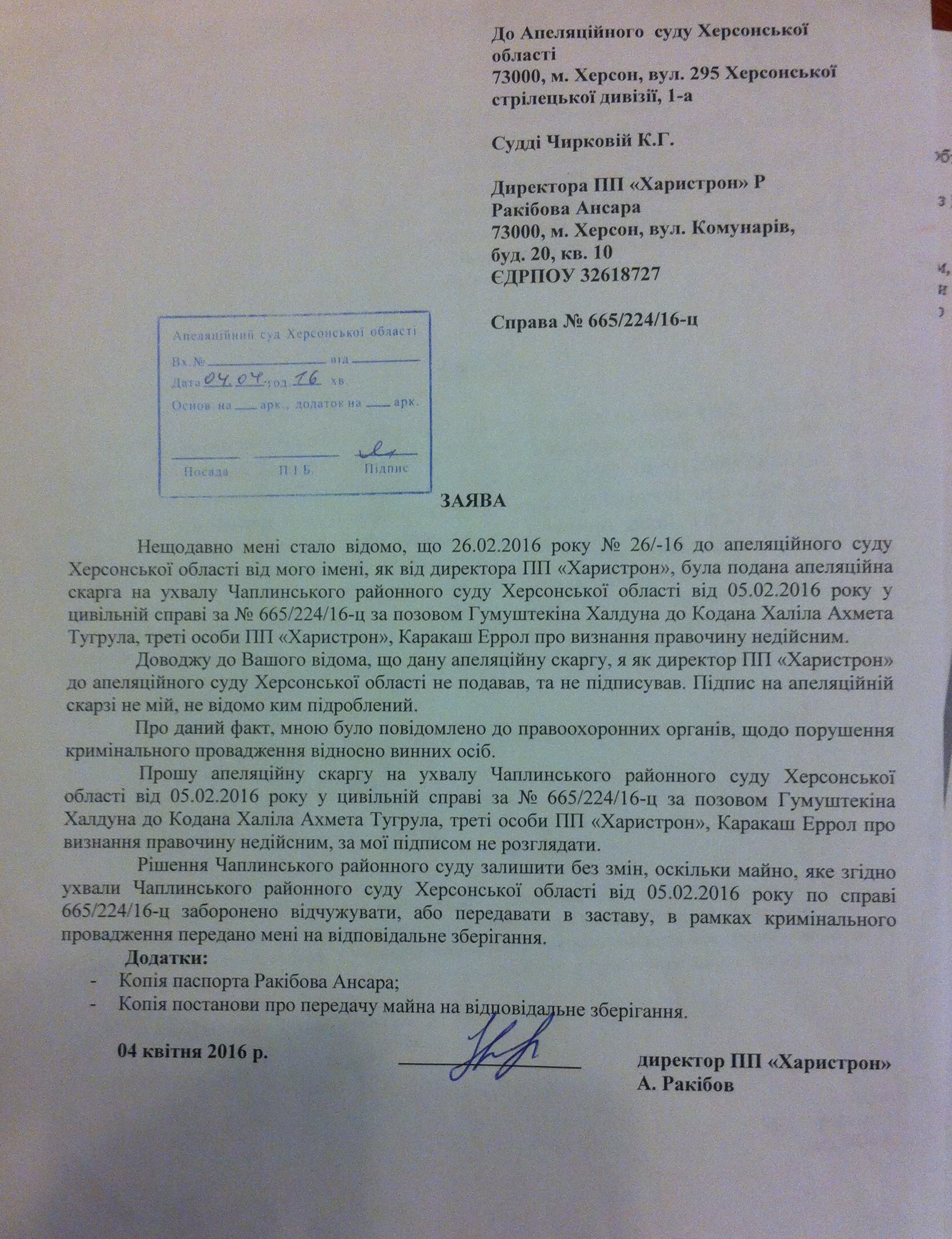По словам нашего источника, указание о закрытии уголовных дел в отношении Ахмеда Кодана спустилось свыше, а именно из самой Генеральной прокуратуры, исполнение же произошло на уровне областной и Чаплинской районной прокуратур. Якобы связующим звеном между представителем беглого преступника стал Василий Черников, который до работы в Генпрокуратуре 5 лет был областным прокурором на Херсонщине — в то время, когда случилось загадочное ДТП в результате которого собственник сельхозбиснеса Халдун стал инвалидом.