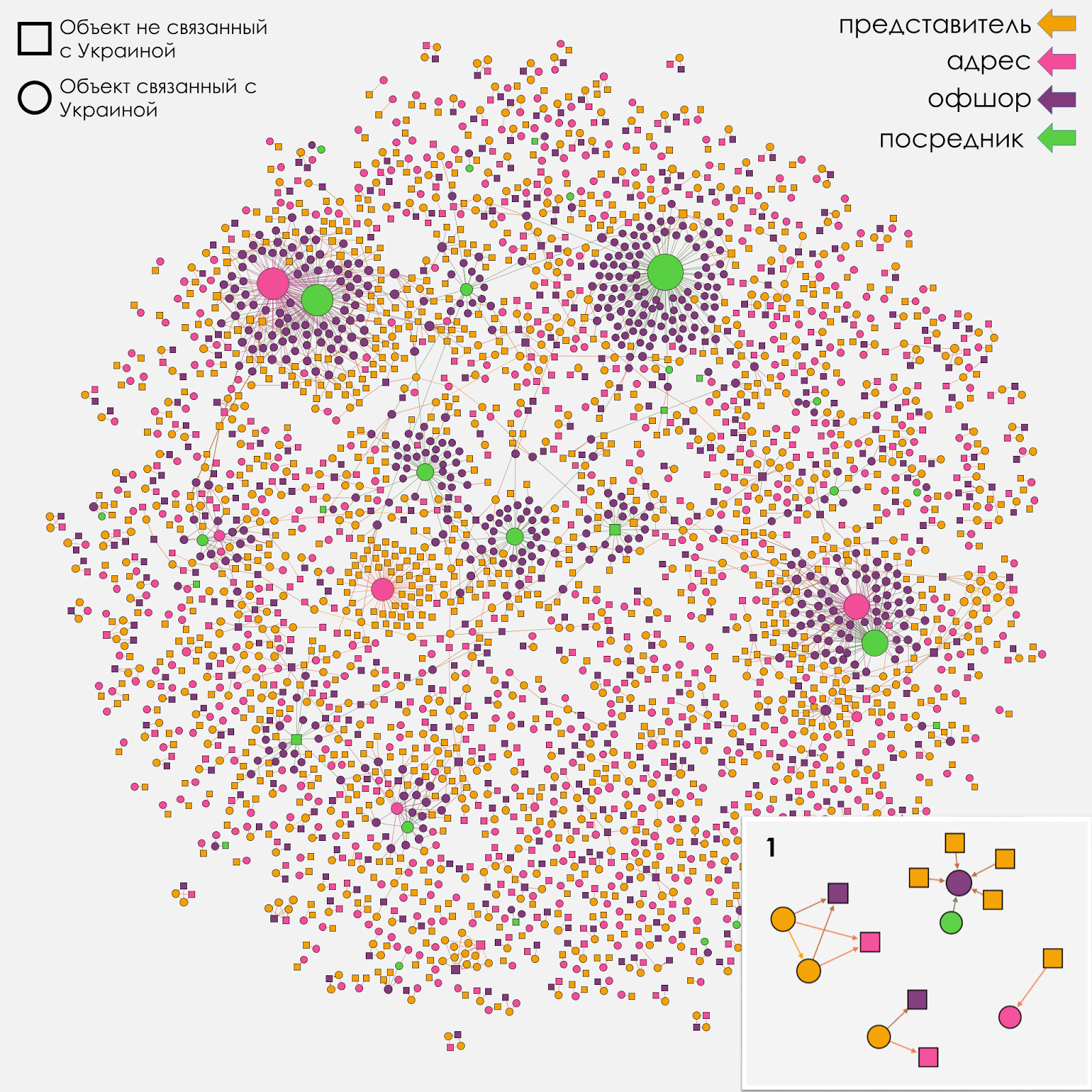 Четыре типа узлов делятся на две группы: узлы, которые связаны с Украиной (представители, адреса и посредники, которые зарегистрированы в Украине) и узлы “внешнего мира” (представители, адреса и посредники, которые зарегистрированы за пределами Украины).