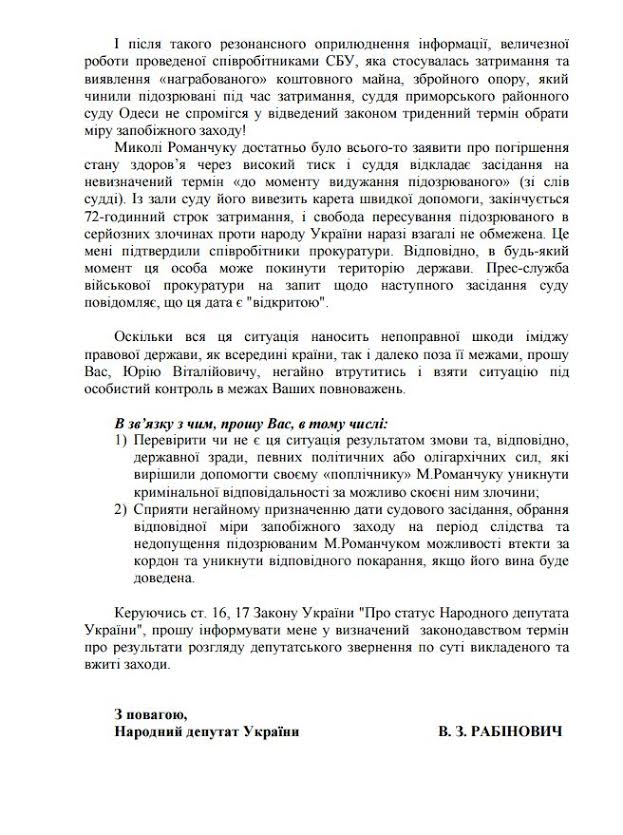 Рабинович просит Луценко не позволить Романчуку бежать из страны