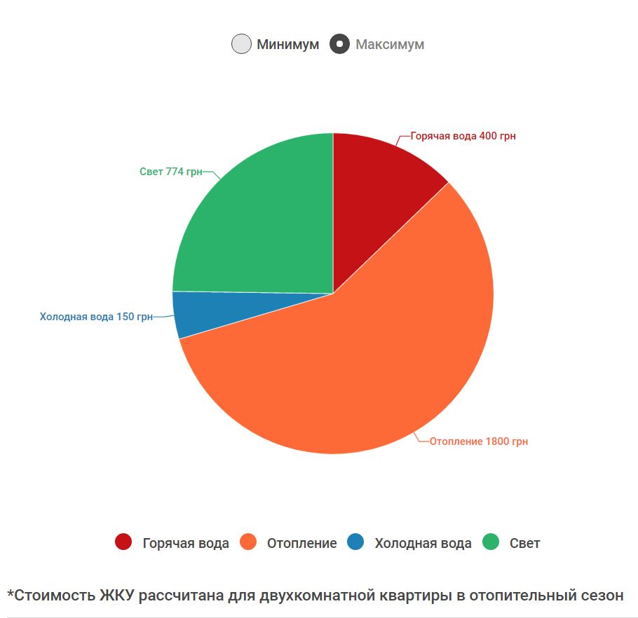 "В отопительный сезон стоимость тепла в двухкомнатной квартире со средней площадью 50-60 кв. м, составит 1500-1800 гривен. На квартиру и на семью в месяц среднее потребление горячей воды составляет от трех до пяти кубов, при стоимости 80 грн за 1 куб. метр. Это означает, что за горячую воду вы должны будете заплатить от 240 до 400 гривен. Таким образом, только на горячую воду и тепло у вас на месяц получится 1740-2200 гривен. Плюс холодная вода и электроэнергия осенью также подорожают. В целом, в отопительный сезон двухкомнатная квартира обойдется гражданам минимум в 3000 гривен", — сказал он.