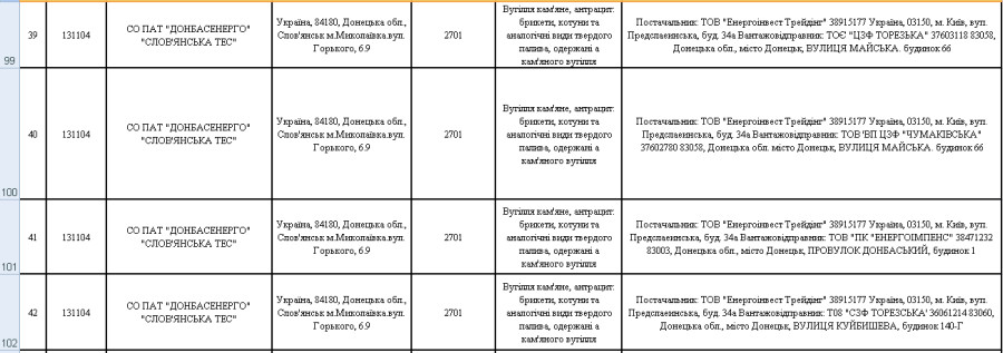 Об ООО «Торговый дом «Энергосбыт» известно, что она была зарегистрирована в апреле 2015-го под названием «Мавер-Аудит», и по одному адресу с ней находится еще одна сомнительная компания, которая называется ООО «Дантрейд ЛТД». Эта фирма имеет такой же уставной капитал – 1000 грн., и тоже получила от «Центрэнерго» договор на поставку угля из АТО на сумму 104 миллиона гривен. Фирма, созданная в конце 2014 года, после заключения договора с «Центрэнерго» была записана на киевлянина Николая Власенко, но основательницей была Оксана Михайловна Горностаева из Красного Луча. Вот этот адрес: г. Киев, улица Олевская 3-Б, офис 1 и офис 1-а. Только там нет никаких офисов – это одноподъездная секция панельного дома на самой окраине Киева, которую арендовала переселенка из Красного Луча. Причем, первый директор«Дантрейд ЛТД» Оксана Горностаева еще в сентябре 2014 года искала работу бухгалтером за 6000 грн. в месяц, а уже через год в качестве Фунта стала ворочать сотнями миллионов…