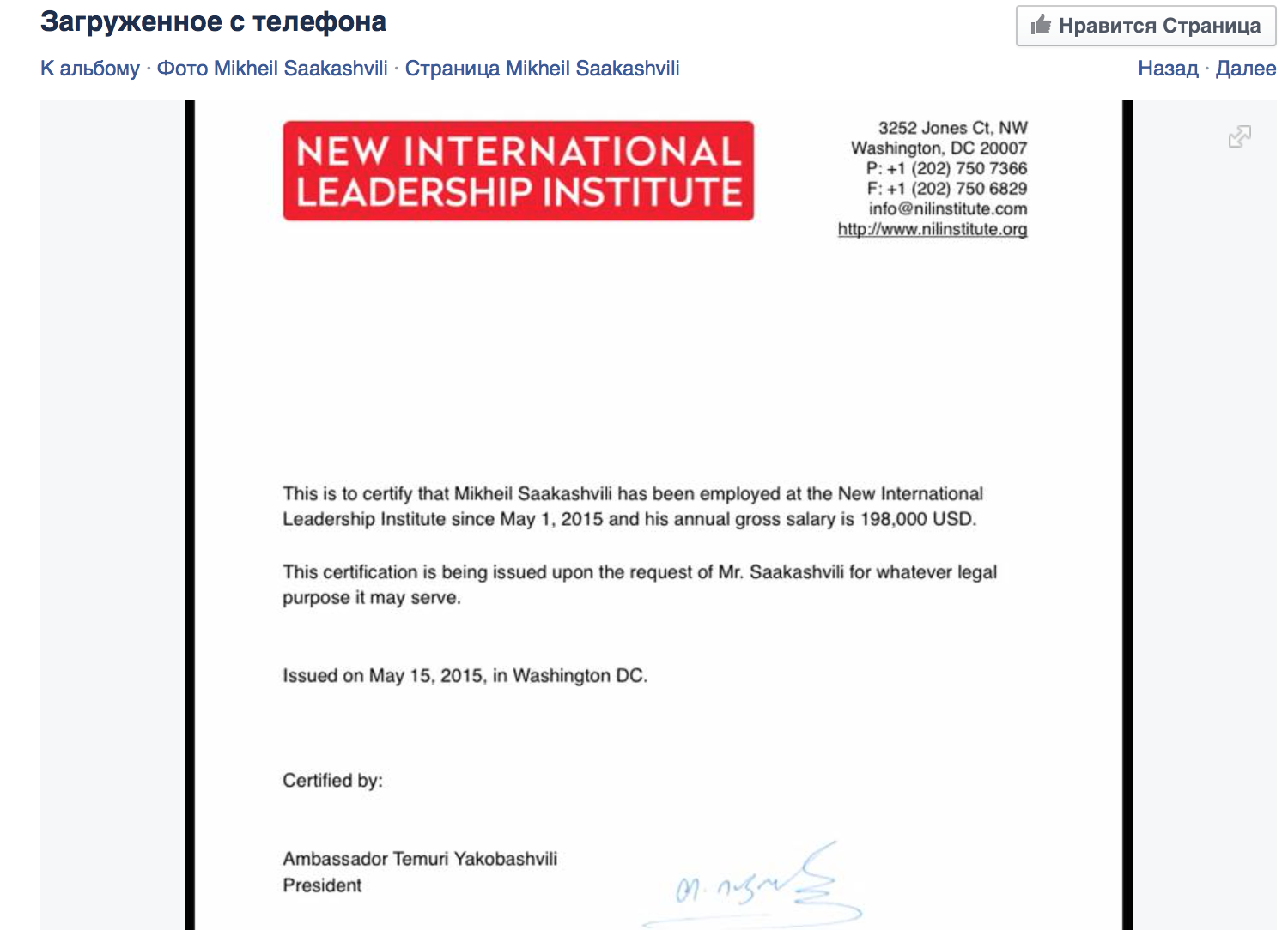 Документ с данными о трудоустройстве губернатора подписал руководитель «института» — соратник экс-президента Тимур Якобашвили, который ранее являлся послом Грузии в США. Отдельно стоит обратить внимание, что координатором проектов и коммуникаций данной структуры является Мари Кокайя, которая еще с прошлого года почему-то находится в Одессе и представляется помощником губернатора, а также до последнего момента занималась координацией украинских СМИ.