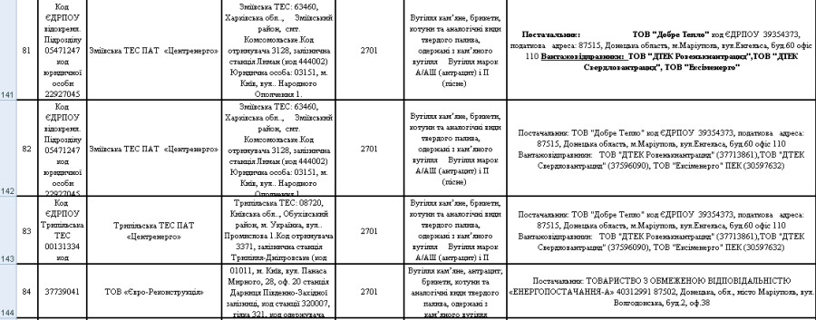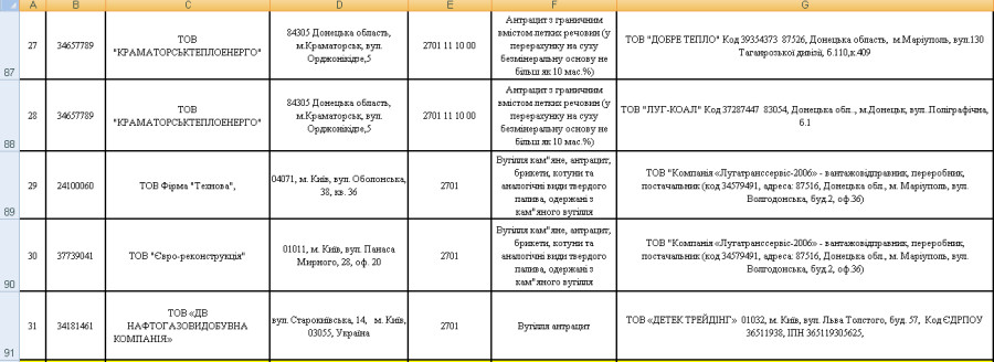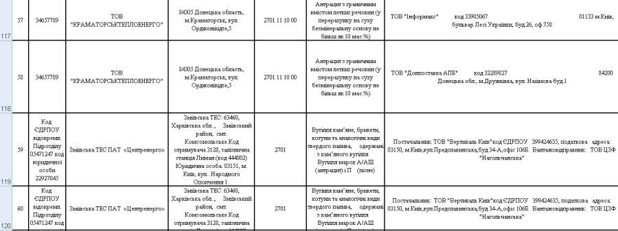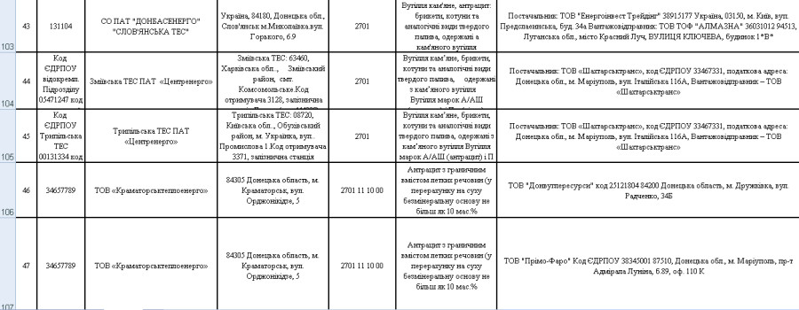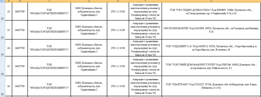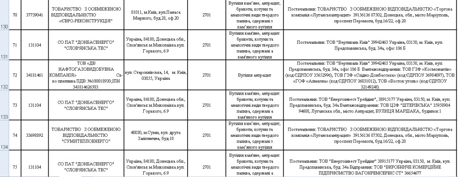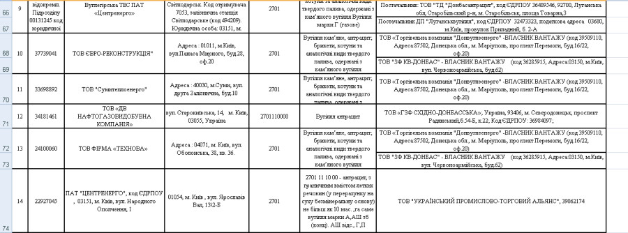 Ознакомиться с полным перечнем предприятий, которые имеют право возить уголь с территории, контролируемой «Л-ДНР» вы можете, просмотрев фото-таблицу. «Андерсон групп», связанная с лидером террористов Денисом Пушилиным – не единственная интересная позиция в этом секретном списке привилегированных. Есть в нем и такой партнер «Центрэнерго», как «Интегралл». Зарегистрированная в г. Старобельске Луганской области по адресу ул.Жовтнева 36, эта фирма имеет в собственниках жителей оккупированного Антрацита, фамилии которых мелькали в одном скандале с заместителями председателя СБУ Виталием Маликовым и Олегом Фроловым. Как сообщали «Наші гроші», вся эта компания оказалась владельцами захваченной земли в заповедном Чернечьем лесу под Киевом. А кто скрывается за зиц-председателями из Антрацита – угадывайте сами. Внимательное изучение списка, который нам достался от неравнодушных угольщиков, позволит обнаружить и другие фирмы-прокладки, которые задействованы в схемах по поставкам из «Л-ДНР».