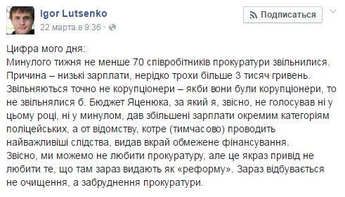 Однако, в ответ Юрий Луценко заявил, что он, дескать, так же, как и президент Украины, хотел бы говорить о повышении зарплат. Но он разделяет точку зрения такую, что сначала прокуратура «должна дать результат стране, получить доверие в обществе», и только в результате этого, якобы, можно будет говорить об увеличении заработной платы.