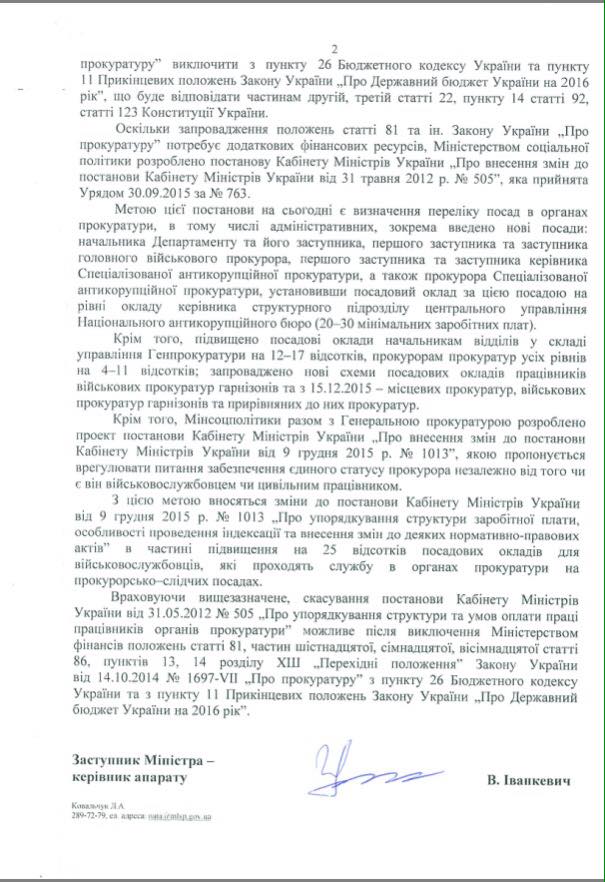 При этом, министерство ссылается на изменения в Постановление «Об упорядочивании структуры и условий оплаты труда работников прокуратуры», принятые 30.09.2015 года Кабмином, где вводятся «новые должности» в перечень сотрудников, которым положена особая оплата (там, в частности, упоминаются административные должности НАБУ и Антикоррупционной прокуратуры).