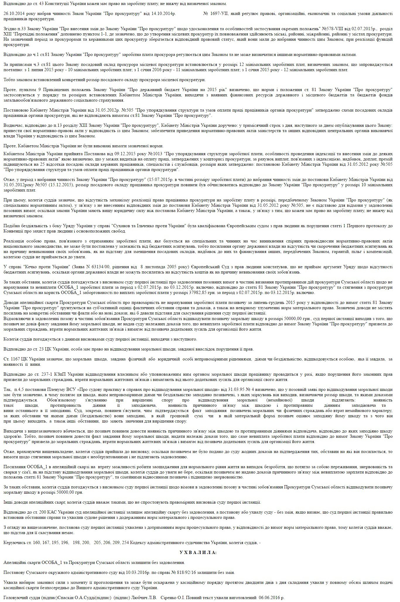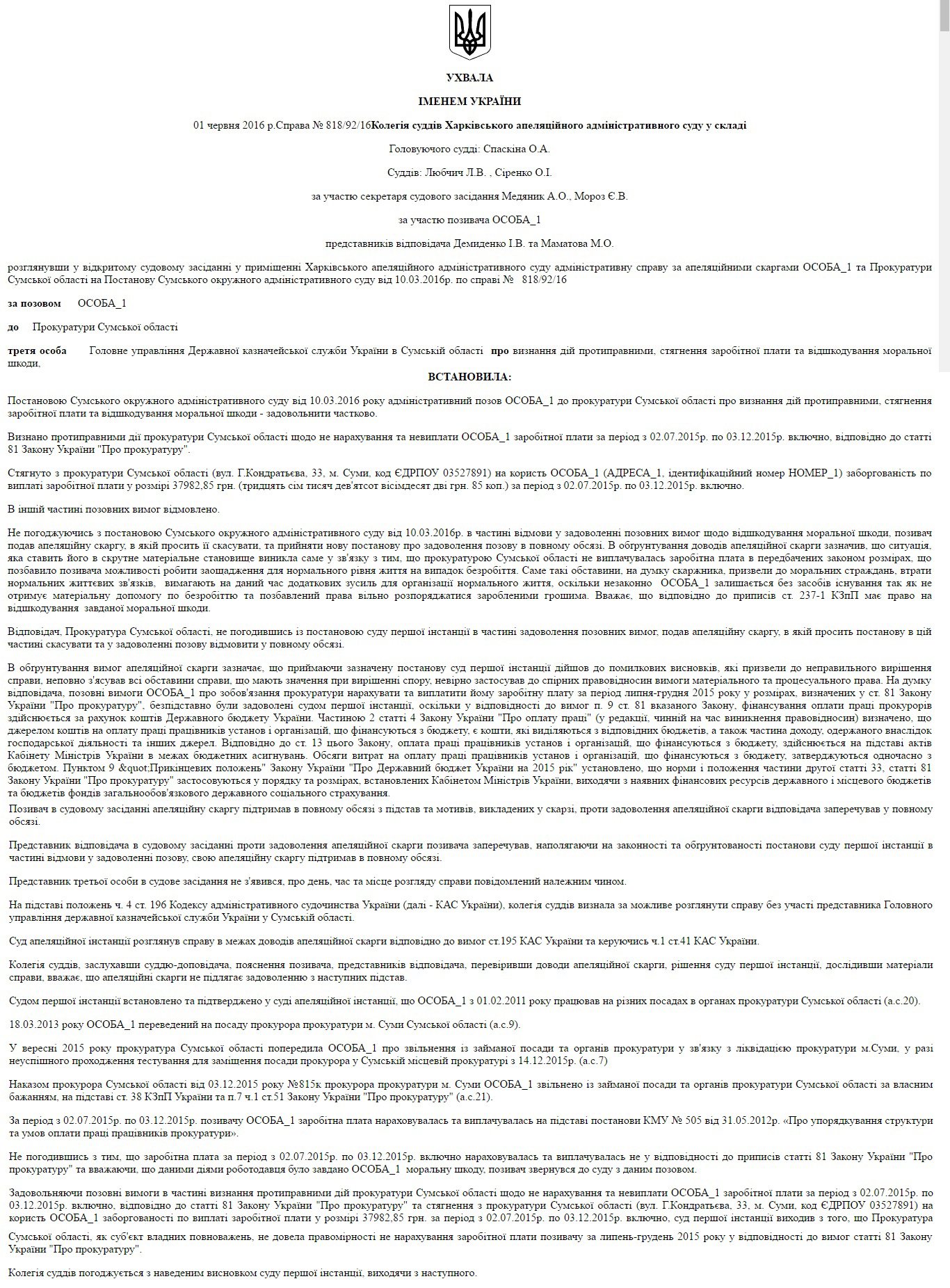 10 марта Сумской окружной административный суд частично удовлетворил иск бывшего прокурора прокуратуры города Сумы к прокуратуре Сумской области Сергея Калинина и своим решением обязал надзорное ведомство выплатить ему зарплату за июль-декабрь 2015 года в соответствии с нормами ст. 81 закона «О прокуратуре», а не согласно тарифных сеток, установленных распоряжением Кабмина.