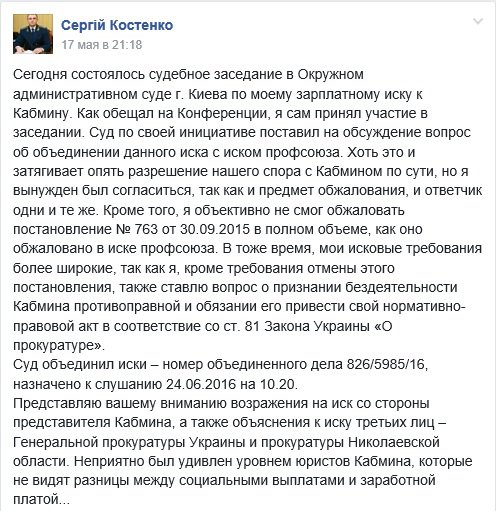 Он подает соответствующий иск в Киевский окружной административный иск с требованием отмены отдельных положений Постановления Кабмина № 763 от 30.09.2015 года, а также признания преступной бездеятельности Правительства. Любопытно, что исковые заявления были поддержаны на уровне ГПУ и Николаевской прокуратуры, о чем свидетельствуют соответствующие документы. Ещё интереснее выглядит ответная аргументация Кабмина, который отождествляет зарплату прокурора и «социальные выплаты», а также постулирует тезис о том, что, фактически, правительство может «крутить» государственными финансами по своему усмотрению.