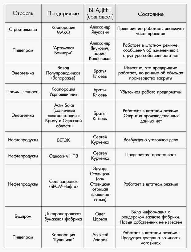 Разумеется, любой бизнес "больших" людей состоит из десятков, а то и сотен дочерних, оффшорных компаний, торговых домов, компаний по управлению и т.д. и т.п. Мы пытались выделить "базисные" активы. В большинстве случаев собственность сохраняется за старыми владельцами. Воистину украинцы терпеливый народ.