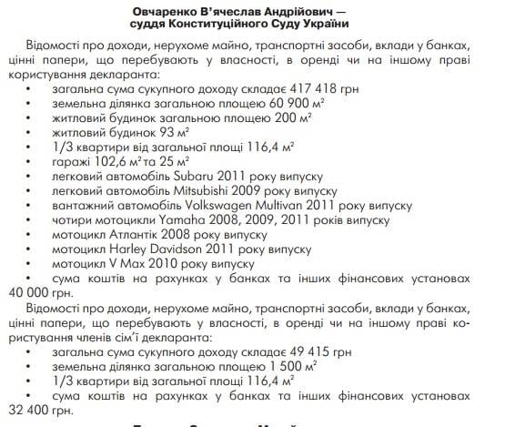 У экс-председателя Конституционного суда Вячеслава Овчаренко при стягивании алиментов обнаружили в декларации недвижимость, много транспортных средств и немаленькие суммы на счетах.
