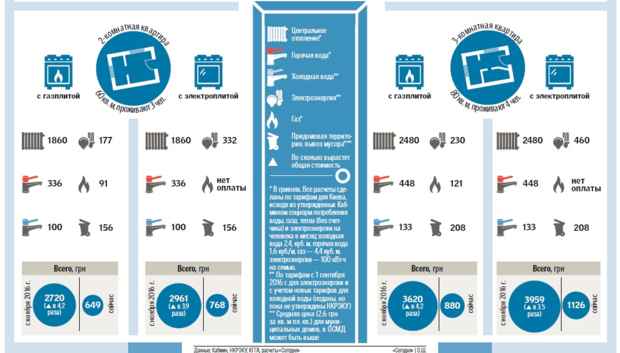 "Сегодня" подсчитала, сколько заплатят жители квартир и частных домов разной площади и типа отопления (см. инфографику). Оказалось, платить придется больше в 3—5 раз больше, чем сейчас. "Это значит, что семьи с доходом ниже 4000 грн на человека уже будут иметь право на субсидию, так как по закону на комуслуги не должно идти больше 15% дохода. То есть две трети семей, или около 10 млн человек пойдут оформлять госпомощь, на это нужно порядка 85—90 млрд грн из бюджета", — подсчитал экономист Александр Охрименко. Сейчас субсидии оформили 5,5 млн украинцев.