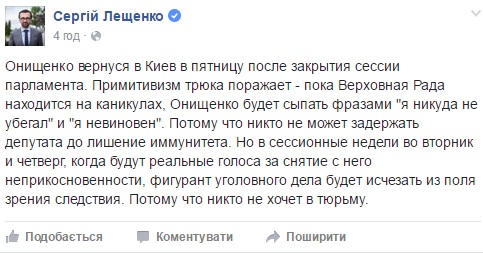 Нардеп Сергей Лещенко, комментируя произошедшее, выразил мнение, что, мол, Онищенко вернулся в день, когда заседаний парламента не планируется, и может покинуть страну, когда Рада снова заработает, и, соответственно, сможет лишить его неприкосновенности.