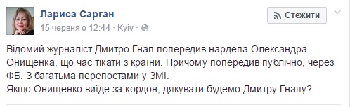 Утром 15 июня 2016 года журналист Дмитрий Гнап публикует у себя на страничке в сети facebook сообщение о том, что по его информации готовится представление на лишение нардепа Александра Онищенко депутатской неприкосновенности.