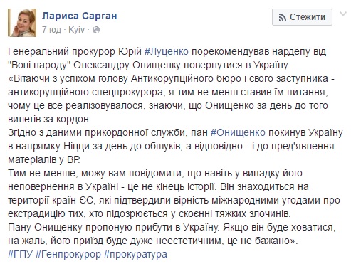 17 июня 2016 года от имени Юрия Луценко его пресс-секретарь Лариса Сарган озвучилаобращение к Онищенко с предложением «добровольно вернуться» в Украину, угрожая в обратном случае «применить экстрадицию из ЕС».