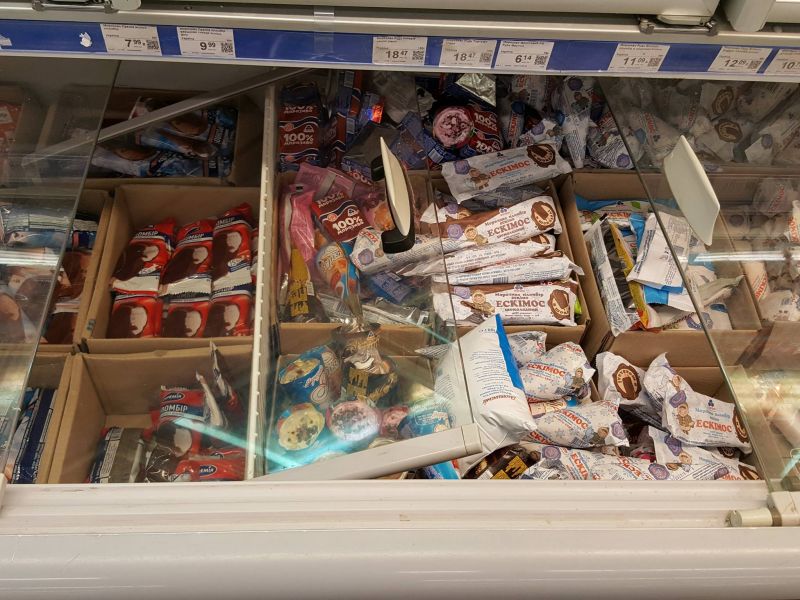 Вот это овощной отдел и отдел мороженого в одном из крупнейших в стране магазинов на Днепровской набережной, 33 в Киеве.