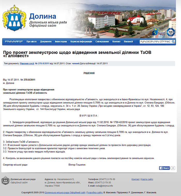 Учредителями фирмы в 2011 году были Мирослав Яковина, Михаил Горчак и Богдан Оныськив. Через несколько месяцев Оныськива сменила Надежда Шкутяк - мать Петра Шкутяка. В 2009-2011 году, когда горсовет выделял ООО «Галинвест» землю, Петр Шкутяк возглавлял Долинскую РГА.