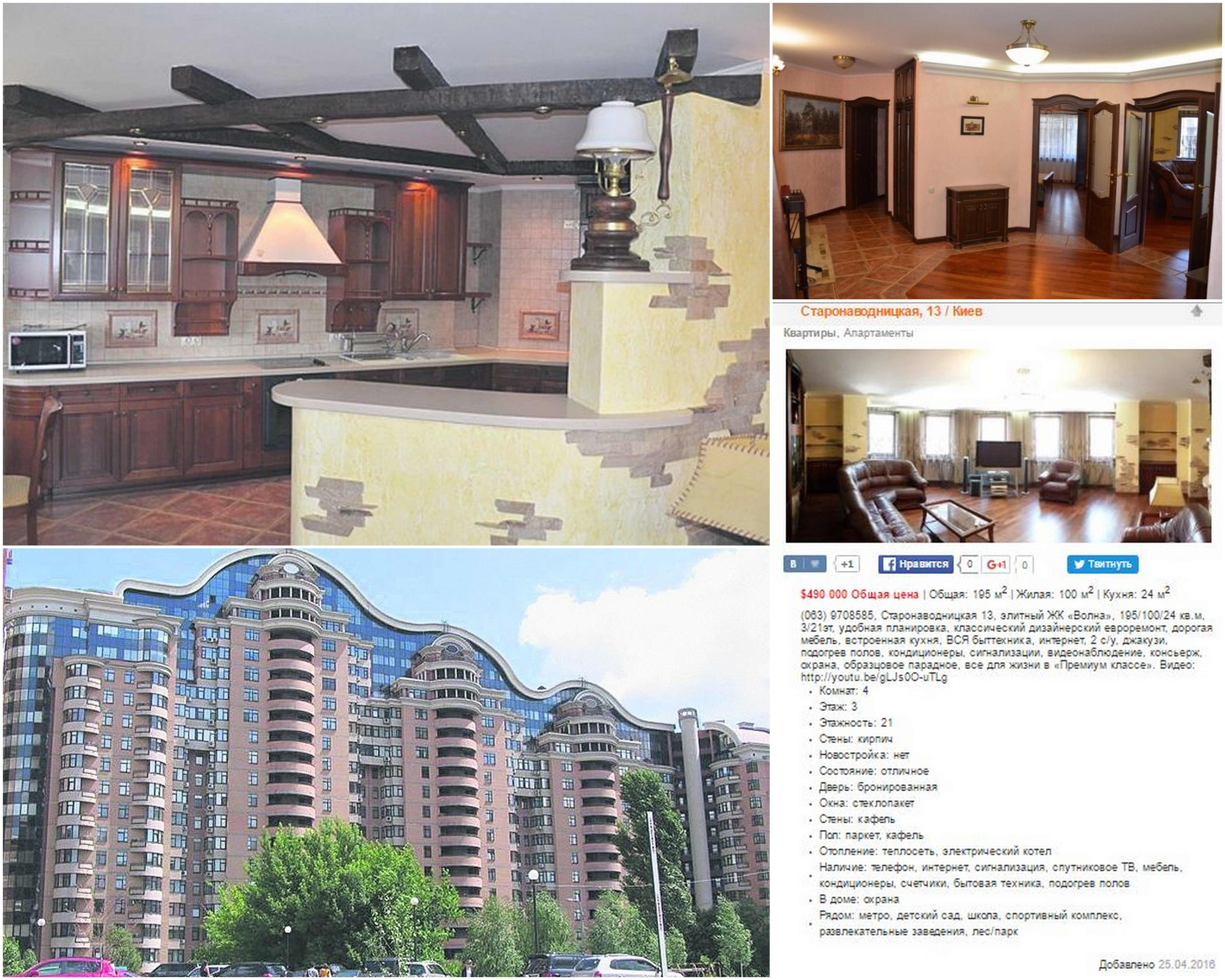В декларации значатся две квартиры: одна - на 22 кв.м и вторая 181 кв.м. Что касается последней, то Луценко в скобках уточнил, что проживает там. Однако, такой метраж имеет квартира семейства, которая записана на супругов. Она находится в элитном доме-волне на Печерске. Эти апартаменты были выставлены на продажу больше года назад. Сейчас хозяева хотят за квартиру 12,25 млн грн (почти 500 тысяч долларов). А пока нет потенциальных клиентов, жилье сдается в аренду.