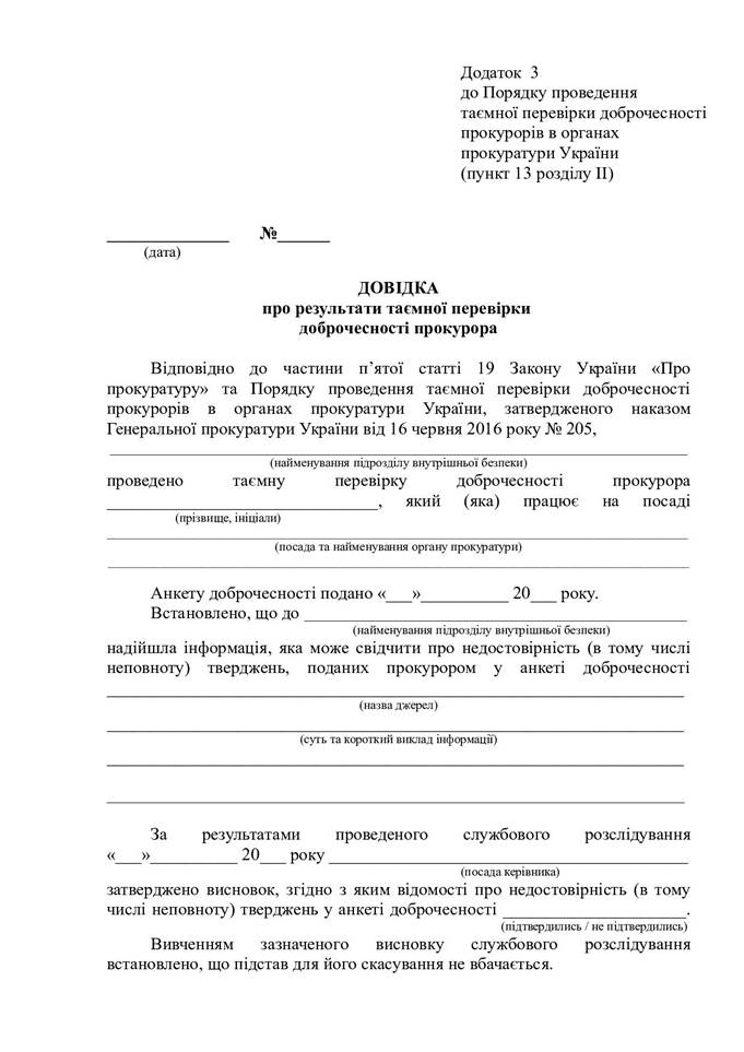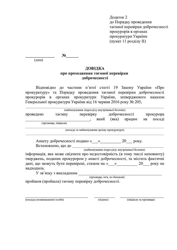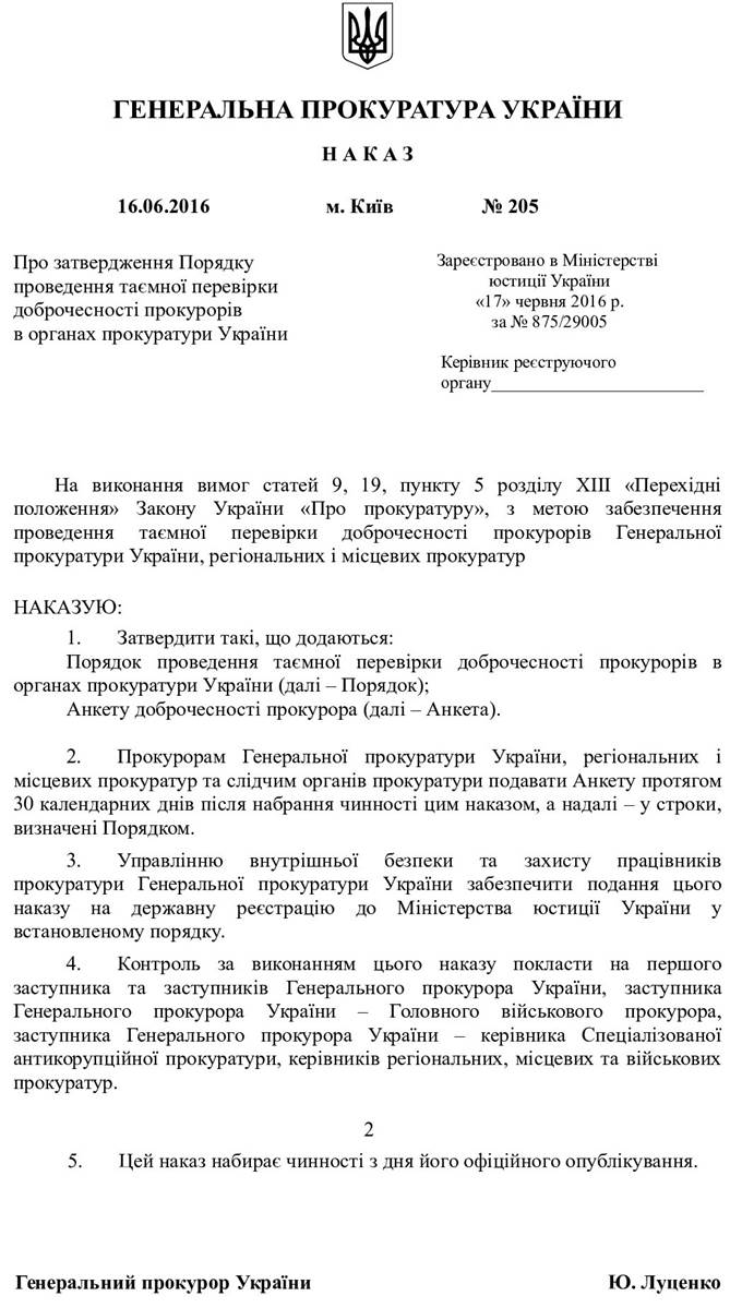24 июня вступил в силу приказ Генеральной прокуратуры от 16.06.2016 № 205, которым утвержден Порядок проведения тайной проверки добропорядочности прокуроров в органах прокуратуры Украины.