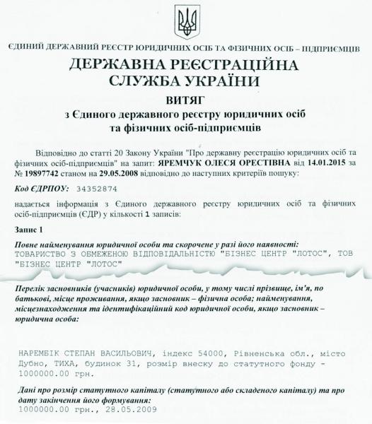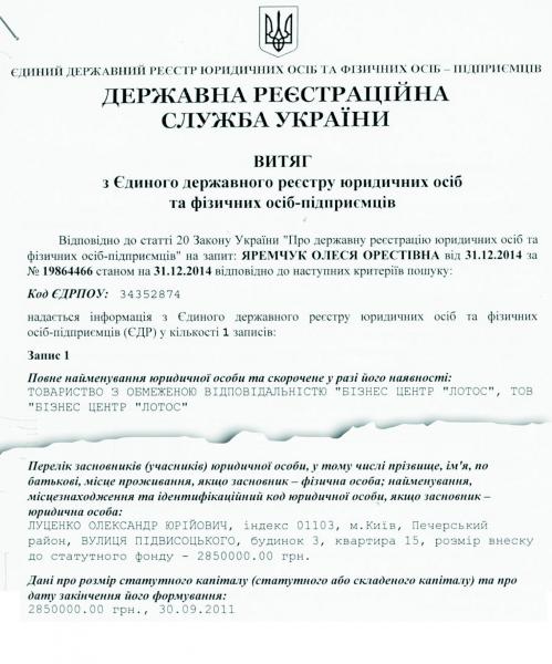 Сейчас тот же бизнес-центр «Лотос» записан на Александра Луценко. Попал он к сыну Генпрокурора «транзитом» через супругу и тестя. По данным госреестра, размер взноса в уставный фонд составляет 2,8 миллиона гривен.