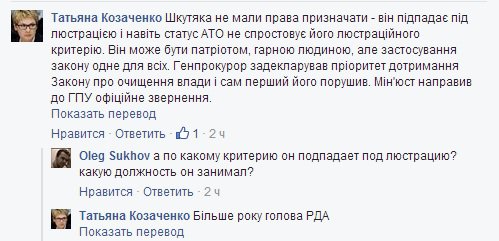«Шкутяка не имели права назначать - он подпадает под люстрацию, и даже статус участника АТО не опровергает его люстрационного критерия. Он может быть патриотом, хорошим человеком, но применение закона одно для всех», - отметила Козаченко. Она обвинила Луценко в том, что он изначально задекларировал приоритет соблюдения закона «Об очищении власти», и тут же его нарушил.