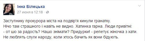 "Заместителю прокурора города во двор бросили гранатку. Ничего там страшного и даже не видно. А вот домик хороший, и люди приветливые. "Ну чт за радость? Зачем снимать? Придурки!", - кричала женщина из дома. Не любят слуги народа, когда кто-то видит, как они бедствуют", - описала журналист свои эмоции после визита домой к Максимчукам.