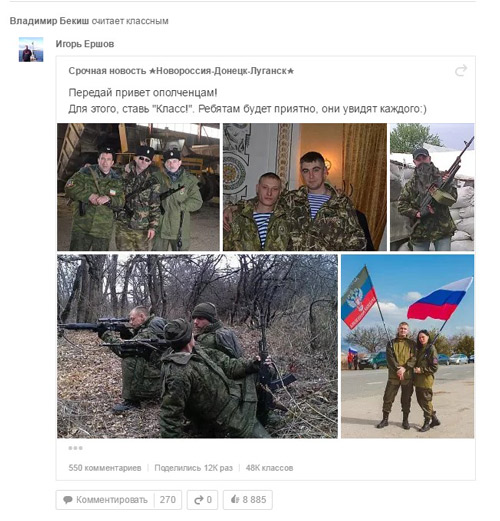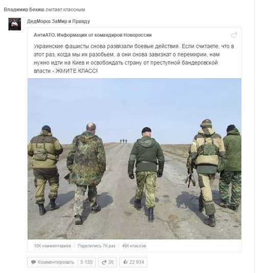 Был ли там Бекиш? Точно неизвестно, но, учитывая должность и военную специальность, – весьма вероятно. Картину дополняют антиукраинские посты в его профиле в «Одноклассниках». Под одной из фотографий – подпись: «Если считаешь, что надо идти на Киев, чтобы “освободить страну от преступной бандеровской власти” – ставь “лайк”». Бекиш картинку «лайкнул», хотя до Киева так и не дошел.