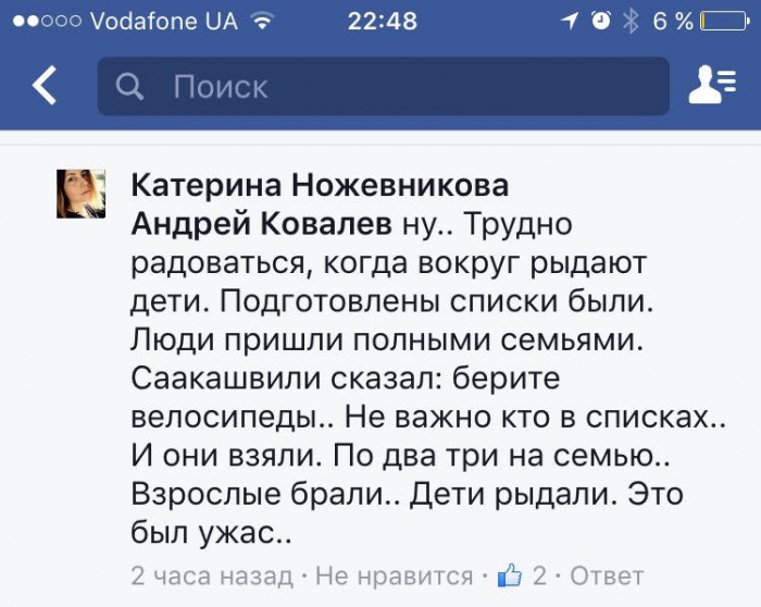 «Списки, сверенные с документами, наличие детей — все было хорошо. При том, что сами родители знали, что на семью — по одному велику, чтоб досталось большему количеству семей. Но при словах «берите велики» люди потеряли совесть и разум! Толкали чужих детей, доставали велики из середины, чуть ли не били чужих детей колесами по головам», — добавляет волонтер Наталья Богаченко.