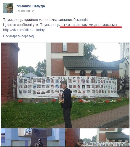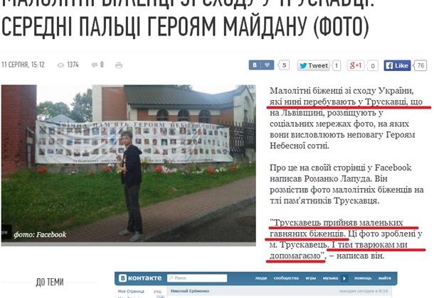 В материале идет речь о том,что «беженцы с востока Украины, которые сейчас находятся в Трускавце на Львовщине», размещают в социальных сетях фото, на которых они высказывают неуважение Героям Небесной сотни и героям Украины.