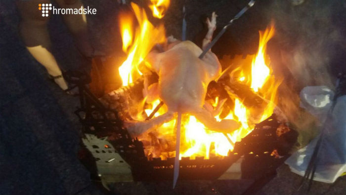 Во время пикета Автомайдановцы провели своеобразную при которой на мангале в виде Кремля жарили двуглавую курицу. Также участниками были зажженные файеры. Зажаренную курицу они оставили на воротах имения.